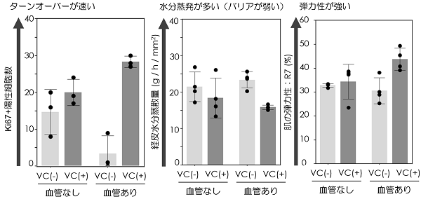 さらに、血管の有無による人工皮膚のビタミンCに対する反応性を比較しました。その結果、肌の保湿バリア機能、透明感等に重要な役割を果たすターンオーバー機能、しわたるみに関わる肌の弾力性について、血管付与によってビタミンCの有用性が増強されることが確認されました(図4)。