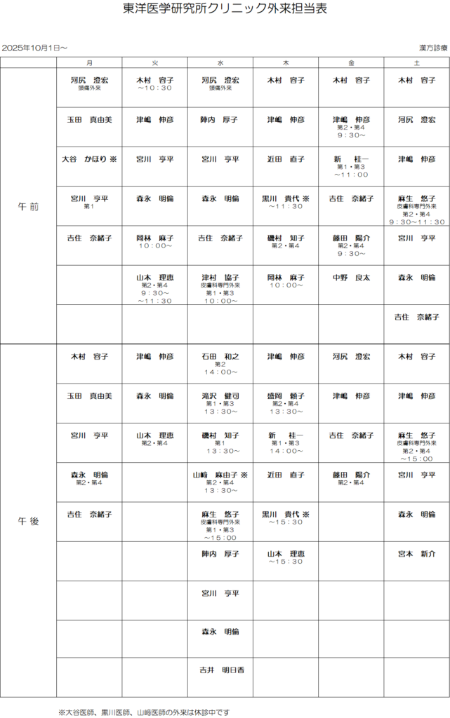 10月の外来担当表