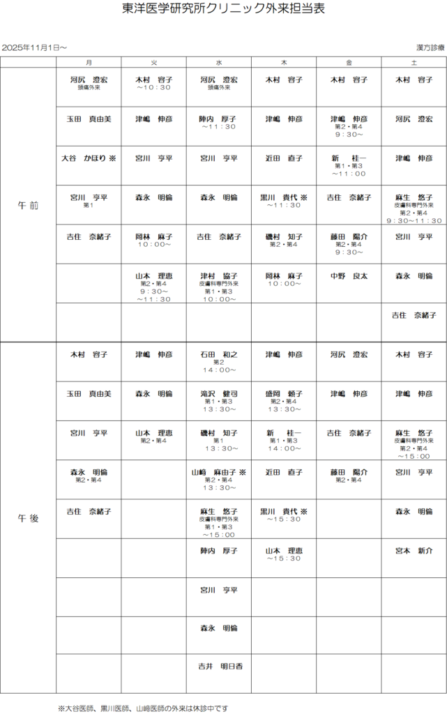 11月の外来担当表