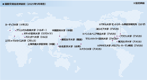 その後、国際交流協定校を増やし、現在その数は世界9カ国・地域に13校を数え、2025年5月までに427人の学生をこれらの協定校へ派遣するとともに、受入学生数も432人にのぼっています。 派遣留学は第6学年生を対象とし、留学先での病院実習は単位認定されます。年間の派遣学生総数は、コロナ禍以前は25人強、コロナ禍以降は20人弱を数えます。