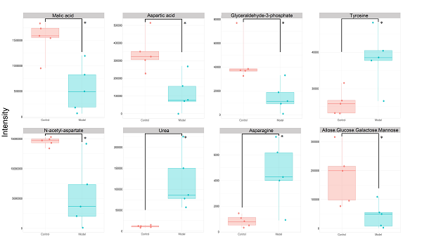 赤色はコントロール群、青色は炎症モデルマウス群を示す。代謝物は上段左から、Malic acid(リンゴ酸)、Aspartic acid(アスパラギン酸)、 Glyceraldehyde-3-phosphate(グリセルアルデヒド-3-リン酸)、Tyrosine(チロシン)、下段左から、N-acetylaspartate(N-アセチルアスパラギン酸)、Urea(尿素)、Asparagine(アスパラギン)、Allose/Glucose/Galactose/Mannose(アロース/グルコース/ガラクトース/マンノース)を示す。