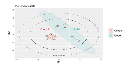 また、多変量解析の一つである潜在構造投影判別分析(PLS-DA)※5を実施したところ、大脳ではコントロール群と炎症モデルマウス群のプロットが良好に分離したことから、大脳の代謝プロファイル※6が異なっていることが示されました(図2)。