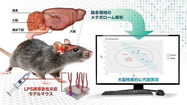 (リポポリサッカライド(LPS)誘導急性炎症モデルマウスの脳メタボローム解析及びバイオインフォマティクス解析により、脳領域特異的な代謝変化と神経炎症の潜在的バイオマーカーを同定した)