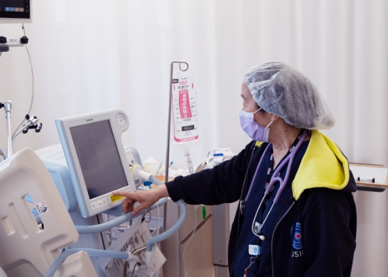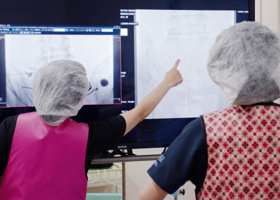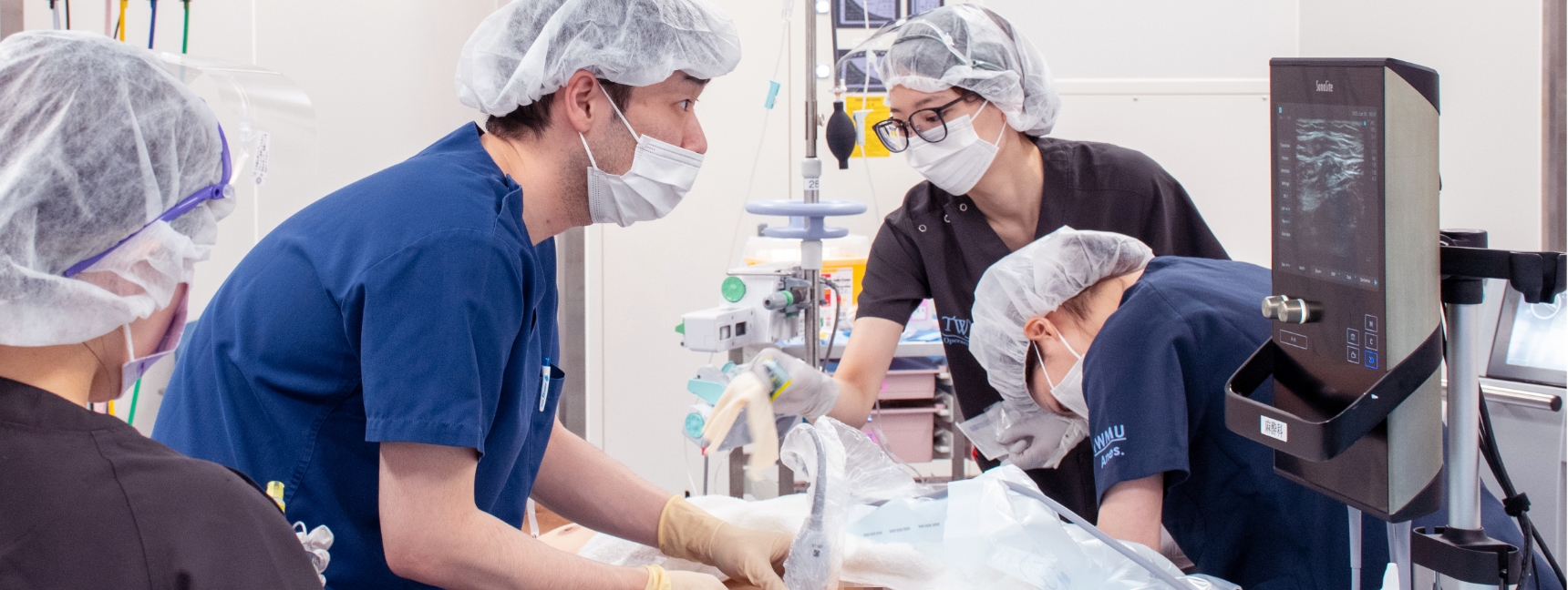 当院では一般臨床麻酔を通じて、硬膜外麻酔、脊髄くも膜下麻酔、区域麻酔、超音波ガイド下血管穿刺、分離肺換気管理など、多くの基本手技を実践的に学ぶことができます。特に硬膜外麻酔は集中的に担当する機会があり、将来にわたって生かすことができる確かな技術の取得は、麻酔科医としての強みになります。