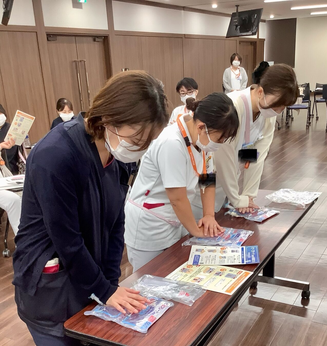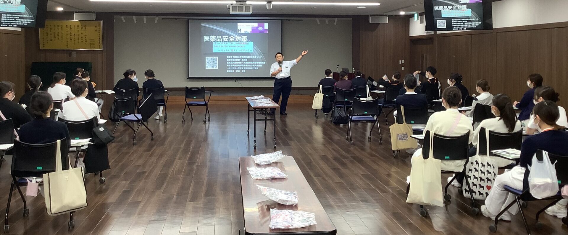 薬剤部部長による『薬剤の安全管理』のプログラムでは、講義と演習(点滴薬剤の二槽バック製剤の隔壁開通確認)で、正しい手順・確認方法などを学びました。