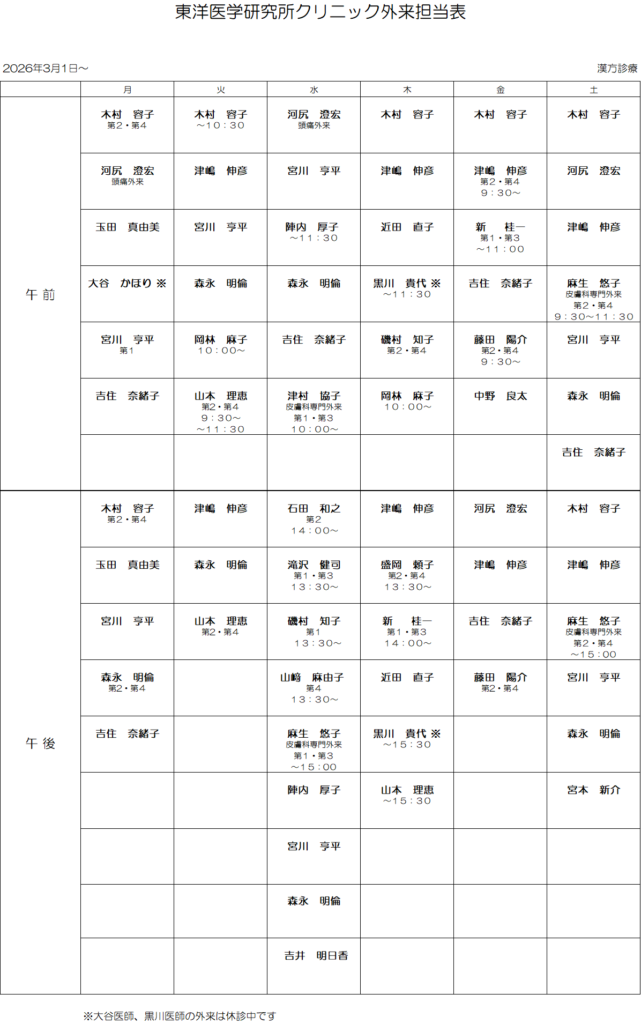 3月の外来担当表