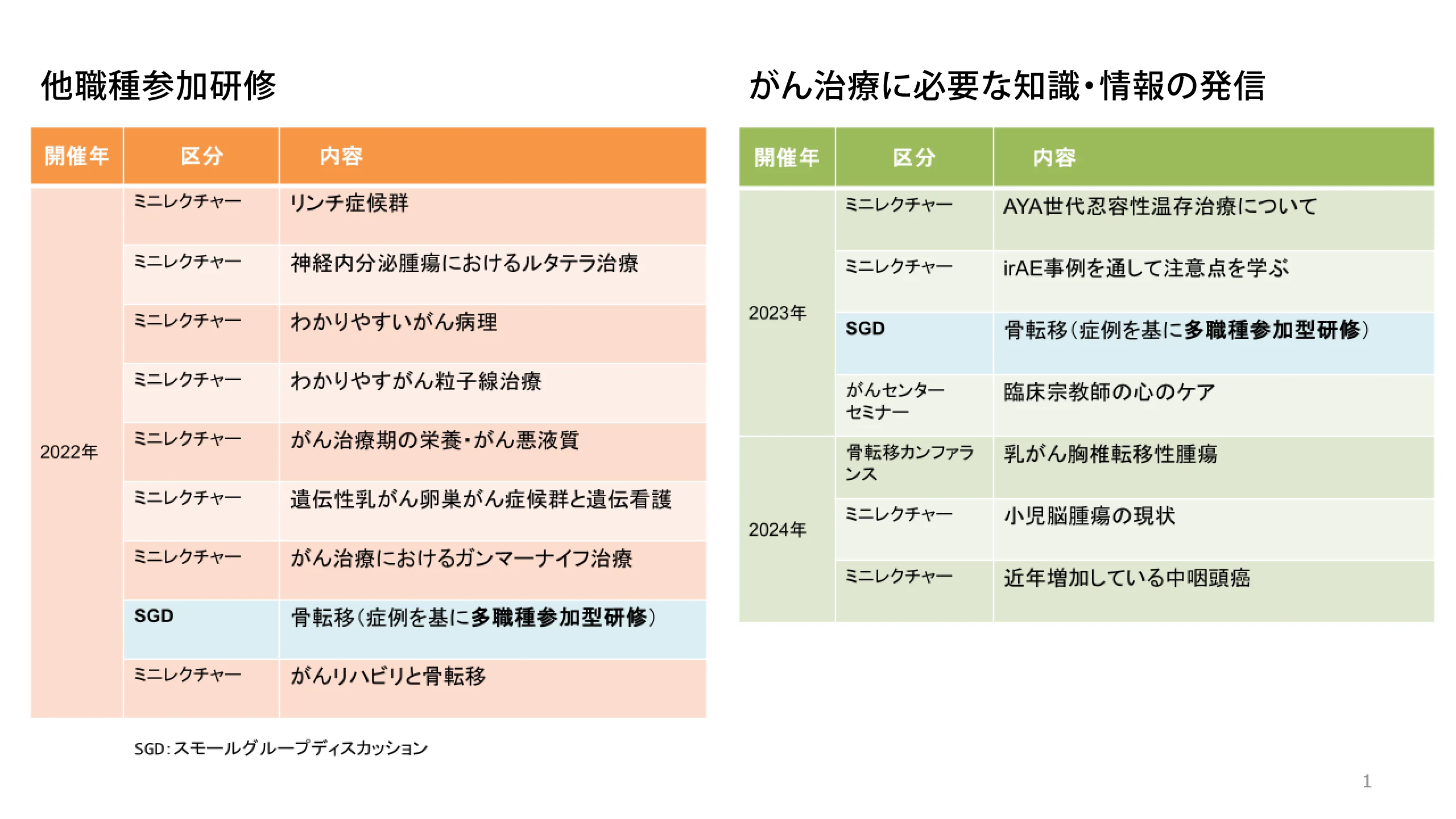 自施設の診療従事者等に、がん対策の目的や意義、がん患者やその家族が利用できる制度や関係機関との連携体制、自施設で提供している診療・患者支援体制について学ぶ機会を提供しています。