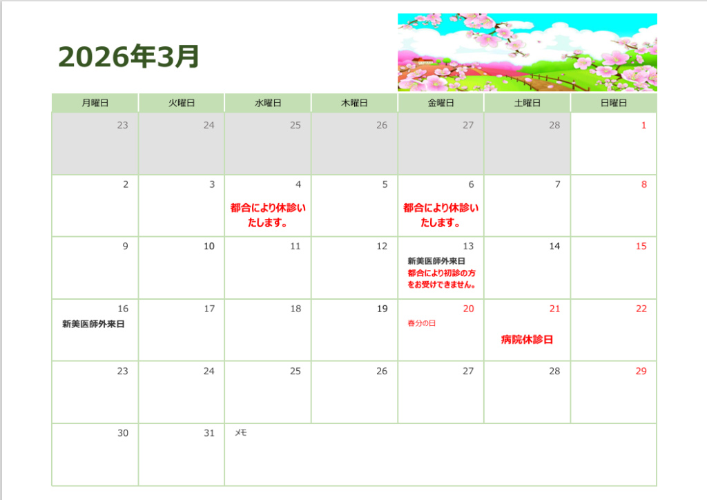 | 午前中 | ★大月 道夫 新美 佑有 (第3のみ) | ★大月 道夫 | ★大月 道夫 新美 佑有 (第2のみ) | 休診 | 休診 | ||