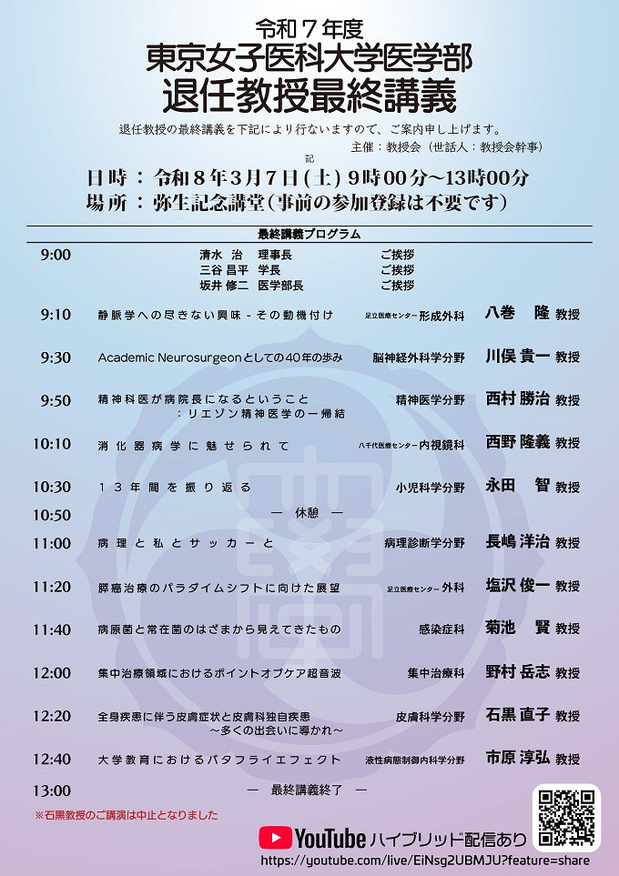 【医学部】退任教授最終講義のお知らせ(一部変更):2026年3月7日(土)