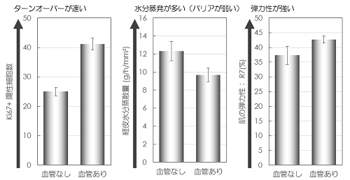 次に、血管の有無による人工皮膚の機能性を比較しました。その結果、肌の保湿バリア機能、透明感等に重要な役割を果たすターンオーバー機能、しわたるみに関わる肌の弾力性について、血管付与による改善が認められました(図3)。