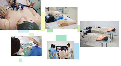 スキルスラボでは、大学、病院、各部門部署の協力の下、様々なモデル・シミュレータのほか、実際に病棟で使われている超音波診断装置、心電計、輸液ポンプ、シリンジポンプ、除細動器などの医療機器を利用することができ、広範囲の演習項目を設定できます。