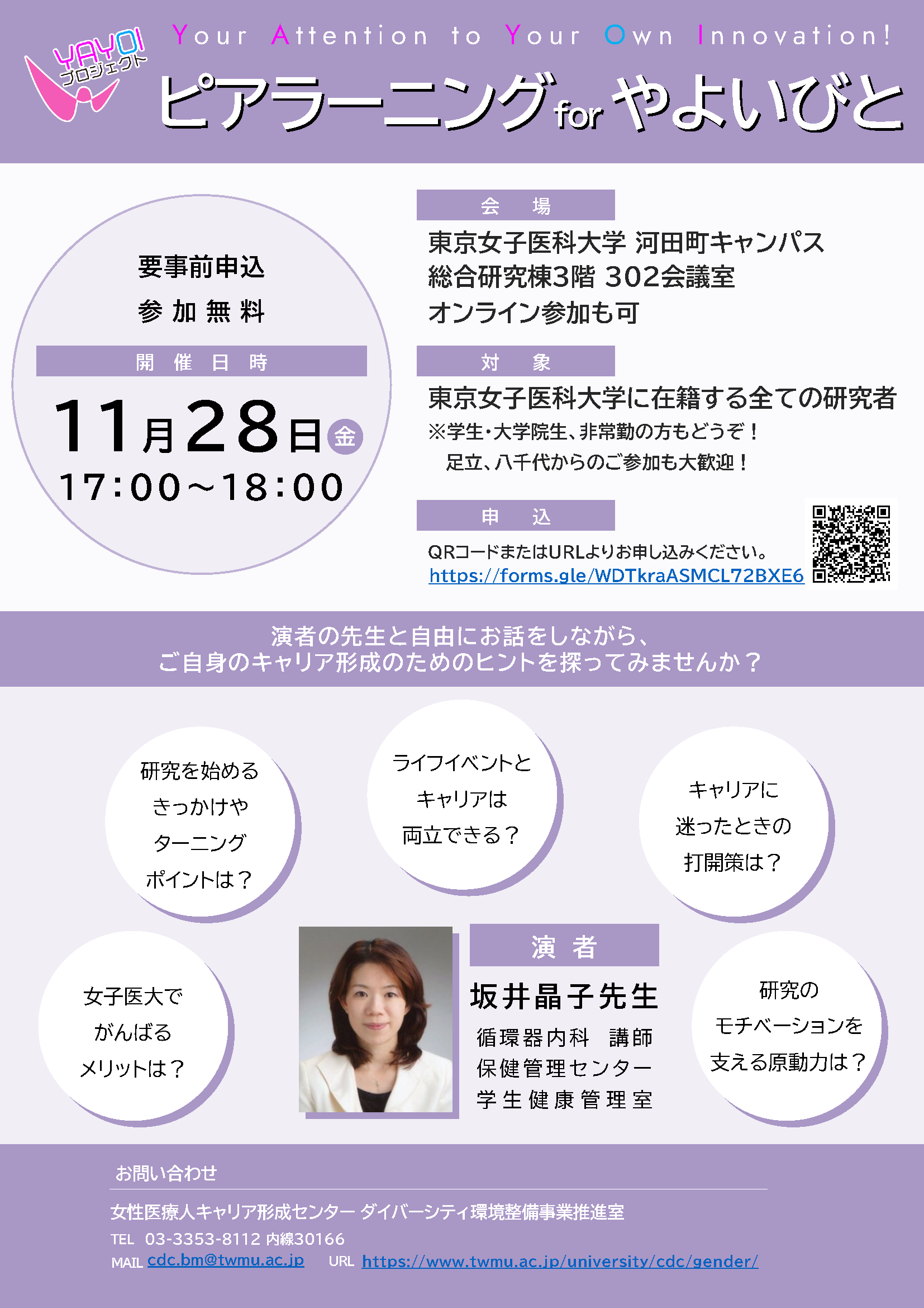 【 会 場 】東京女子医科大学総合研究棟3階302会議室(河田町キャンパス内)、オンライン参加も可