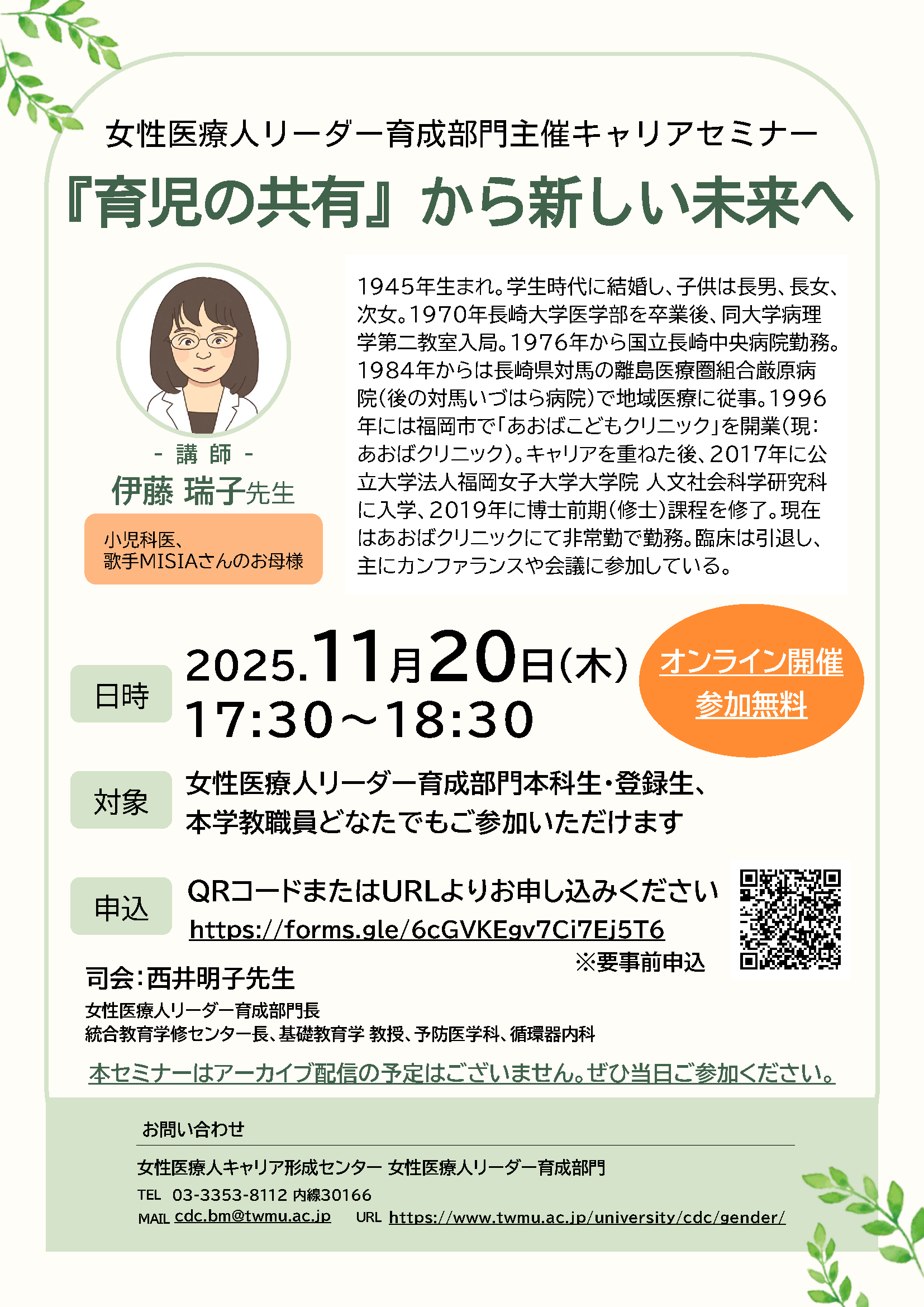 女性医療人リーダー育成部門「キャリアセミナー」を以下のとおり開催します。